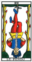 When you look at the trees in the old Marseille card it’s obvious that the branches have  been cut off. Everything that was once his life has been pruned away. BUT . . . the tips of the branches also look very much like buds in the Spring.  Full of life and ready to grow again.