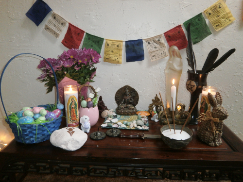 I spent hours cruising through our local stores, purchasing the, “ingredients,” for my little shrine to Spring.  As usual, Dollar General was a treasure trove for low priced holiday decorations.  I bought glittery eggs and plaster bunny rabbits for fertility symbols.  Candles and chrysanthemums and sea shells.  Virgin of Guadalupe’ votives to represent the Goddess. And more bunnies. I went home and dug out my crystals and my pentagrams and my chalice and athame’, and began assembling the altar.