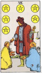 The Five of Wands may show up in a relationship where there’s a LOT of emotional turmoil. In the South, they talk about, “fight and fuck,” relationships. These are relationships where the two people involved have huge fights with much screaming and throwing of plates, and then they reconcile and have make-up sex that’s incredibly good. There are spoken phrases in there like, “Oh, baby, I’m so sorry,” and, “I promise this will never happen again, ‘cause you’re the dumplings in my chicken soup, honey buns.” Yes, I know honey buns and chicken soup are a disgusting combination, but you get the idea. There’s cheating going on, but they’ll probably reconcile and spend the next week in bed.