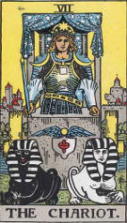 Of course, there’s a major wink in this card. When we look at the two sphinxes that are pulling the chariot he stands in, we realize that (a) they’re sitting down; (b) they’re facing in opposite directions; and (c) there are no harnesses or reins attached to them. In other words, the Charioteer, despite his glorious finery, is going nowhere any time soon.