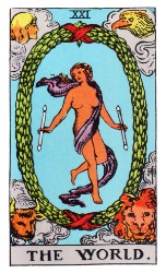 In its traditional meaning, The World card celebrates the completion of one cycle and moving onto the next one.  It’s the, “and they lived happily ever after,” card for, “normal,” people